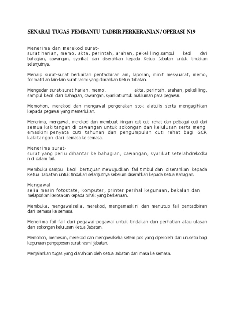 Senarai tugas pembantu tadbir perkeranian mp3 & mp4. Senarai tugas pembantu tadbir perkeranian / operasi n17. Senarai tugas pembantu tadbir gred n19 perkeranian operasi. Savesave senarai tugas pembantu tadbir perkeranian for later. Calon yang layak dan memenuhi syarat lantikan di atas akan dipanggil menduduki peperiksaan online.